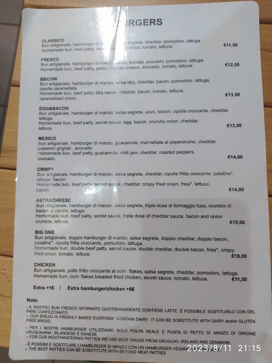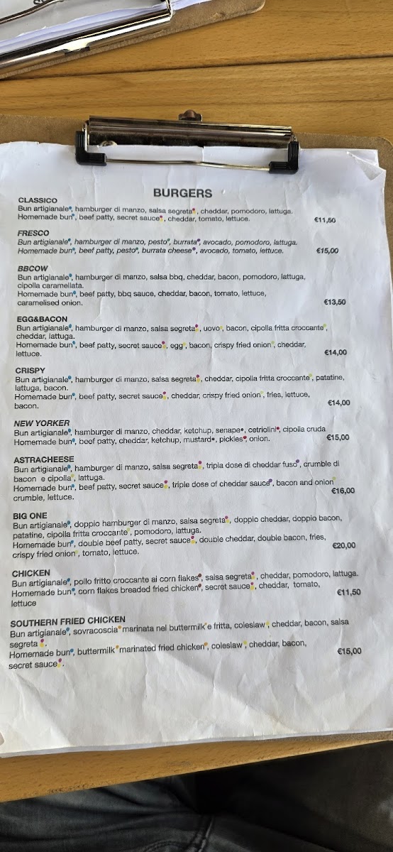 The menu at Lost Cow Castelsardo offers a delightful mix of flavors, with a focus on satisfying and hearty dishes. Standout items include the Crispy Burger Super Juicy, a juicy and indulgent burger that lives up to its name with crispy, perfectly seasoned meat and a delicious balance of toppings. Alongside it, the Fries Bacon & Cheddar are a perfect side dish, offering crispy fries loaded with savory bacon and melted cheddar cheese for that irresistible bite. For those looking to customize their meal, the Extra Hamburger provides a great addition to any order, allowing for extra flavor and satisfaction. The Fresco is another crowd favorite, a refreshing option that balances the richness of other dishes. For cheese lovers, the Astra Cheese adds a flavorful twist with a perfectly melted, creamy layer of cheese that complements its accompanying ingredients. Each dish is crafted with attention to detail, and the overall menu ensures a hearty and flavorful experience for anyone visiting the restaurant.